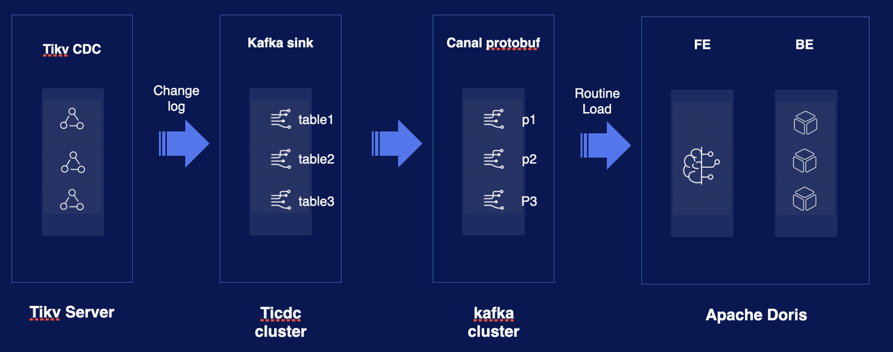 Routine Load:借助 TiDB 的 Drainer 将 binlog 同步到 Kafka,Doris 中通过新增 TiDB Binlog数据格式来实现数据的同步
