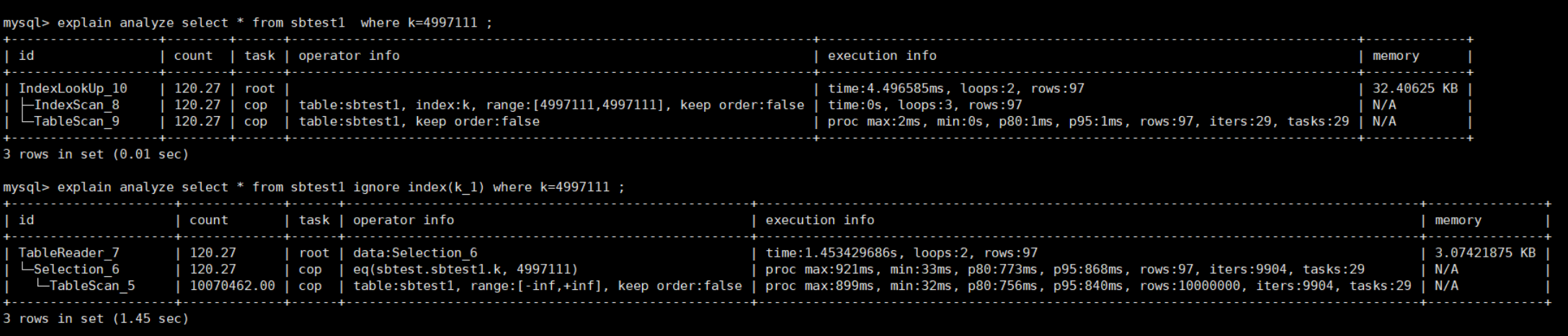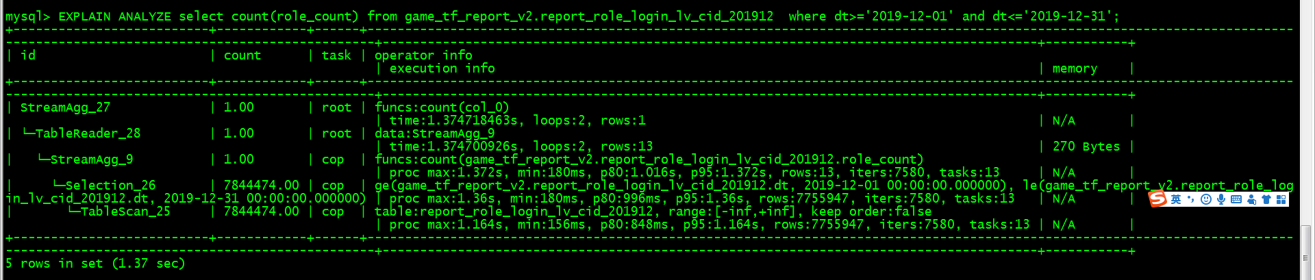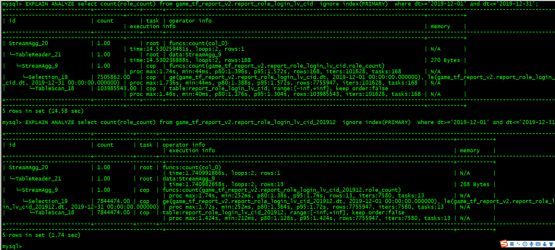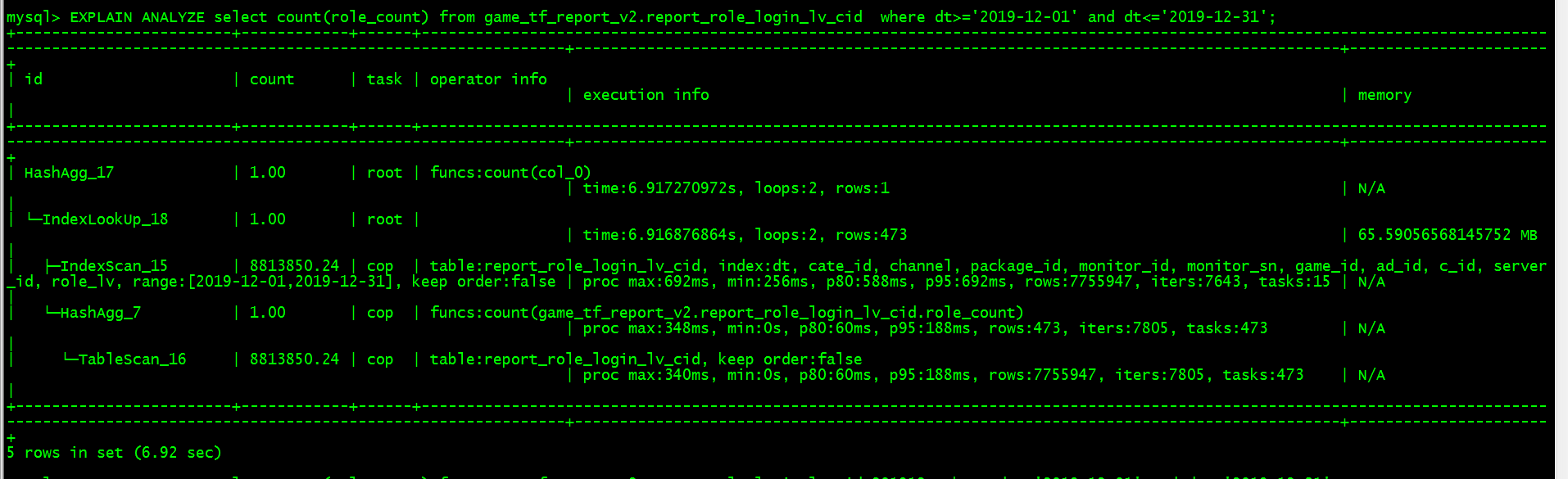 - 【问题描述】:以前mysql 数据量大了就采用按月分表,每月大概100W左右的数据,导入到tidb后,采用一张大表来存储,主键包含dt等多个字段,但在查询过程中,按dt过滤一个月的数据求count 非索引字段,大表耗时太长,在7秒左右,count 结果为 7755947,同样tidb查这个月的分表 也是count 非索引字段,耗时只需要1秒多一点。想知道该怎么优化tikv或tidb的配置,按理说大表的查询速度不应该这么慢才对呢?