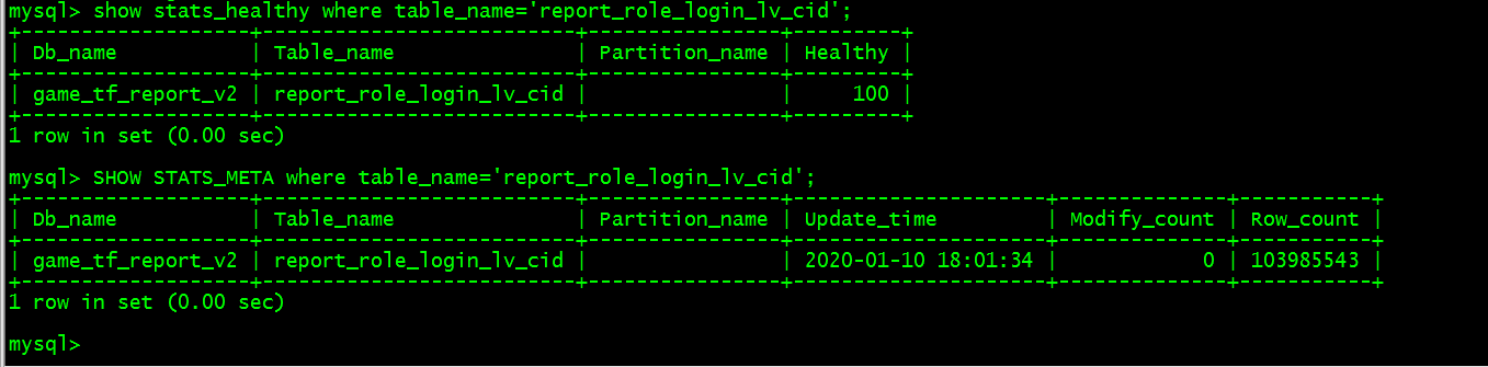 (1)show stats_healthy where table_name=‘report_role_login_lv_cid’; (2) SHOW STATS_META where table_name=‘report_role_login_lv_cid’; (3)