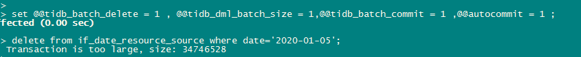 set @@tidb_batch_delete = 1 , @@tidb_dml_batch_size = 1,@@tidb_batch_commit = 1 ,@@autocommit = 1 ;