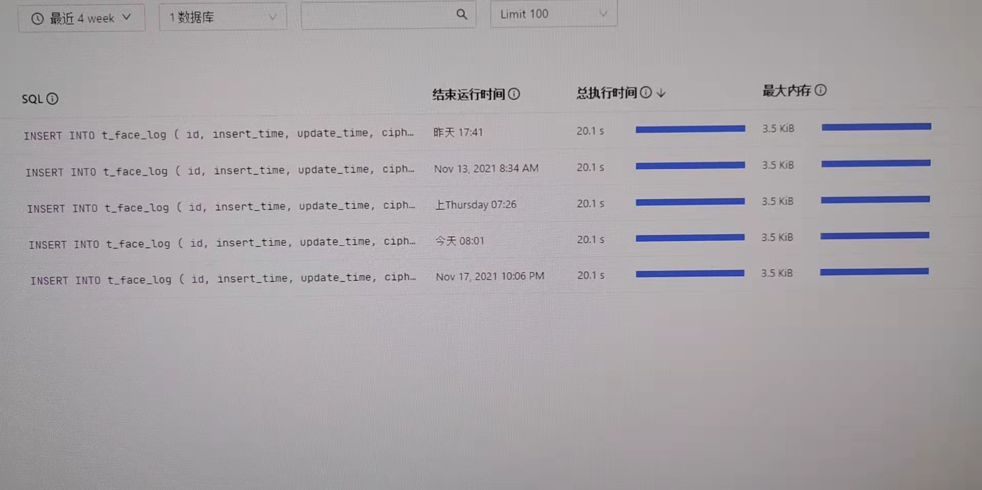 在dashboard界面,查看慢查询,发现一个INSERT耗时非常长: