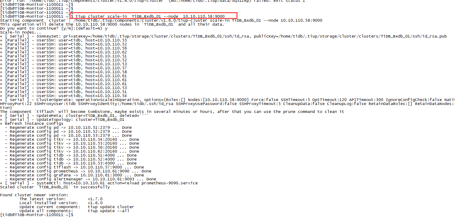 1、 tiup cluster scale-in TiDB_Bxdb_01 --node 10.10.110.58:9000 移除节点
