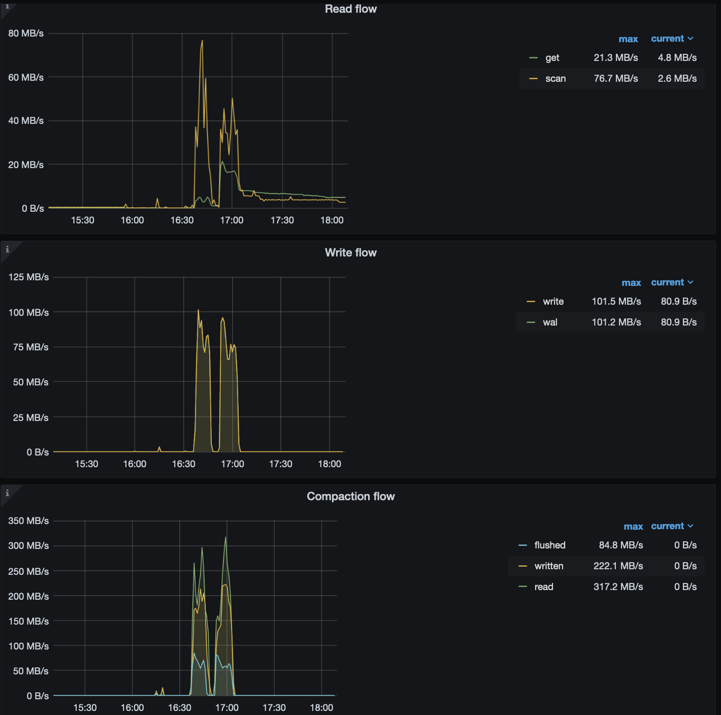 此时,rocksdb-kv 因为达到了 compaction 的阈值,开始进行 compaction 操作,整个集群的 read 、write 以及 compaction flow 较高: