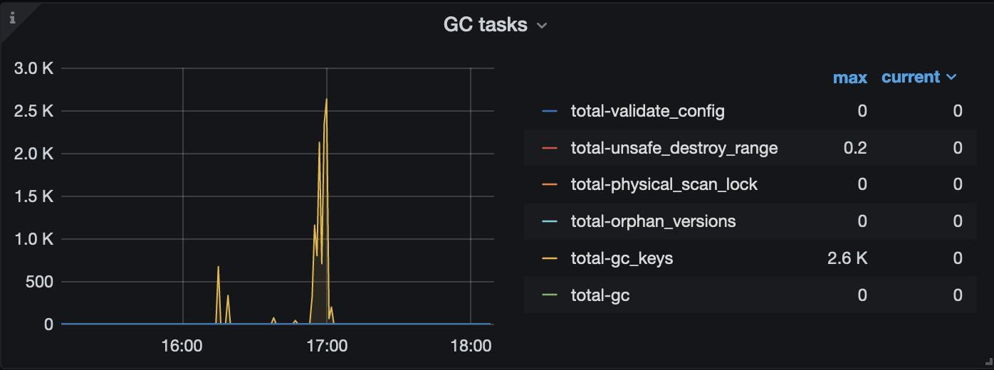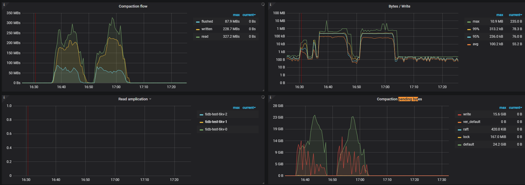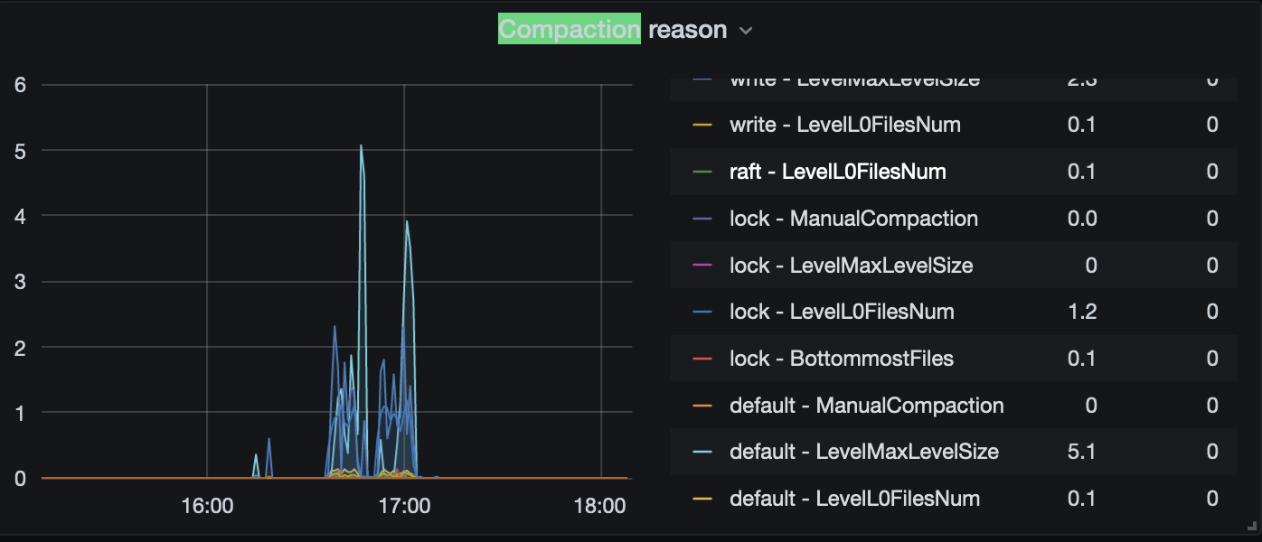 metrics : sum(tikv_engine_pending_compaction_bytes{tidb_cluster="$tidb_cluster", instance=~"$instance", db="$db"}) by (cf,instance)