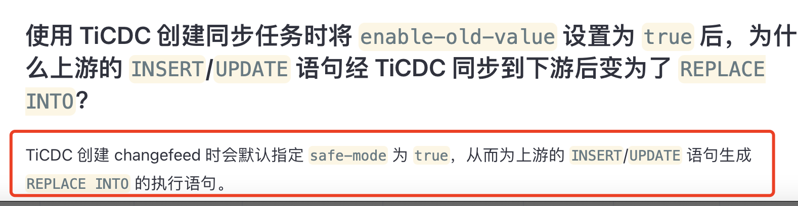 https://docs.pingcap.com/zh/tidb/stable/troubleshoot-ticdc#使用-ticdc-创建同步任务时将-enable-old-value-设置为-true-后,为什么上游的-insertupdate-语句经-ticdc-同步到下游后变为了-replace-into?