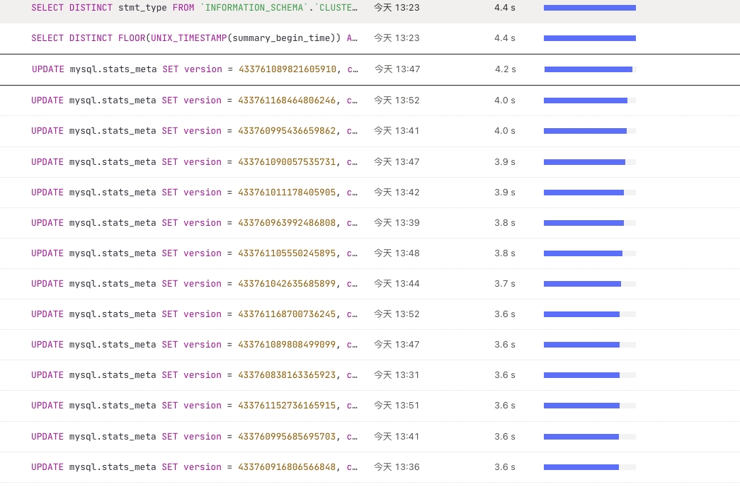 数据库每分钟做一次update mysql.stats_meta …where table_id=17; 且每次要花费3-5S的时间。