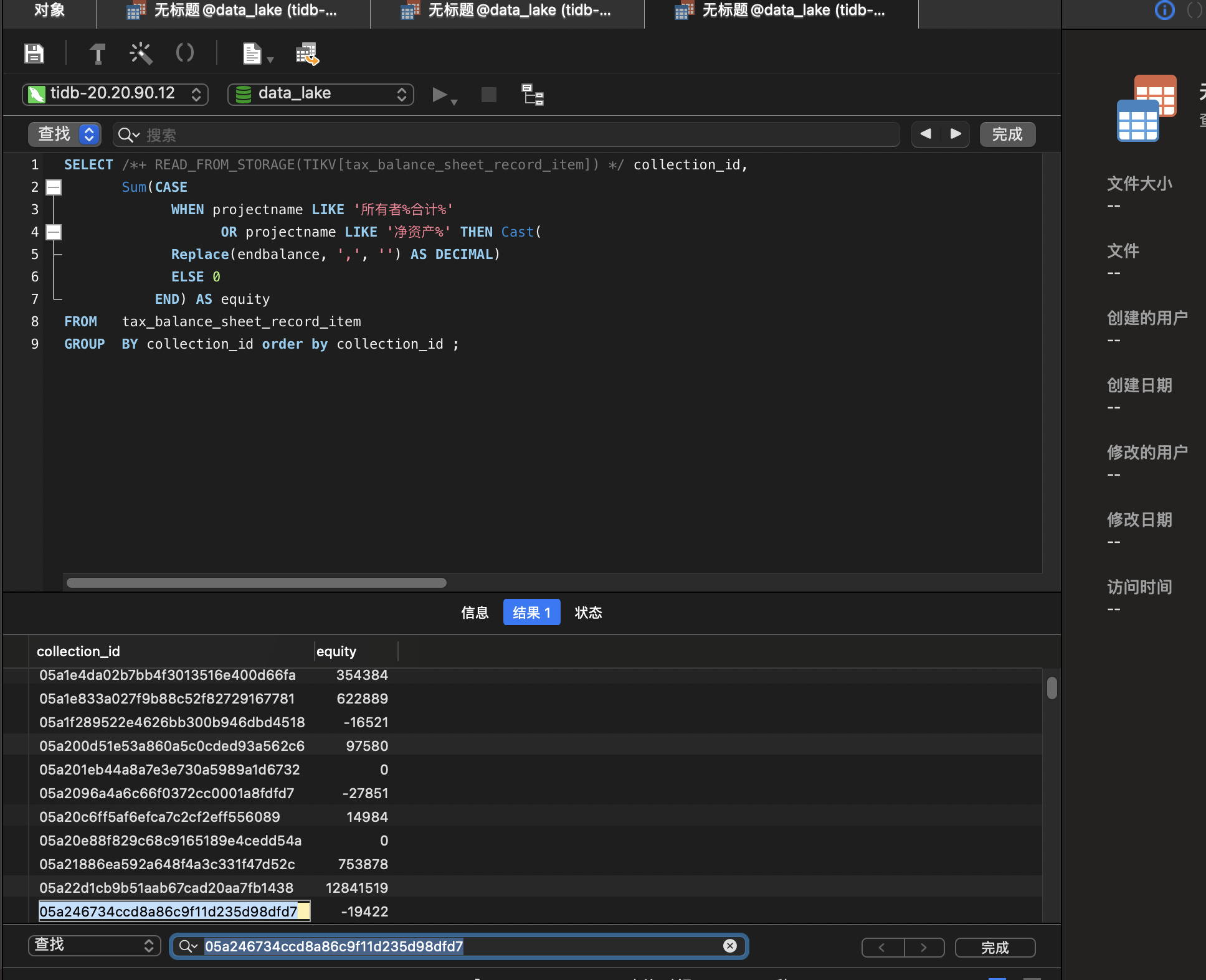 | └─HashAgg_29 | 1875637.08 | 1884317 | batchCop[tiflash] | | tiflash_task:{time:1m48.8s, loops:256, threads:1} | group by:data_lake.tax_balance_sheet_record_item.collection_id, funcs:sum(Column#13)->Column#10, funcs:firstrow(data_lake.tax_balance_sheet_record_item.collection_id)->data_lake.tax_balance_sheet_record_item.collection_id | N/A | N/A |
