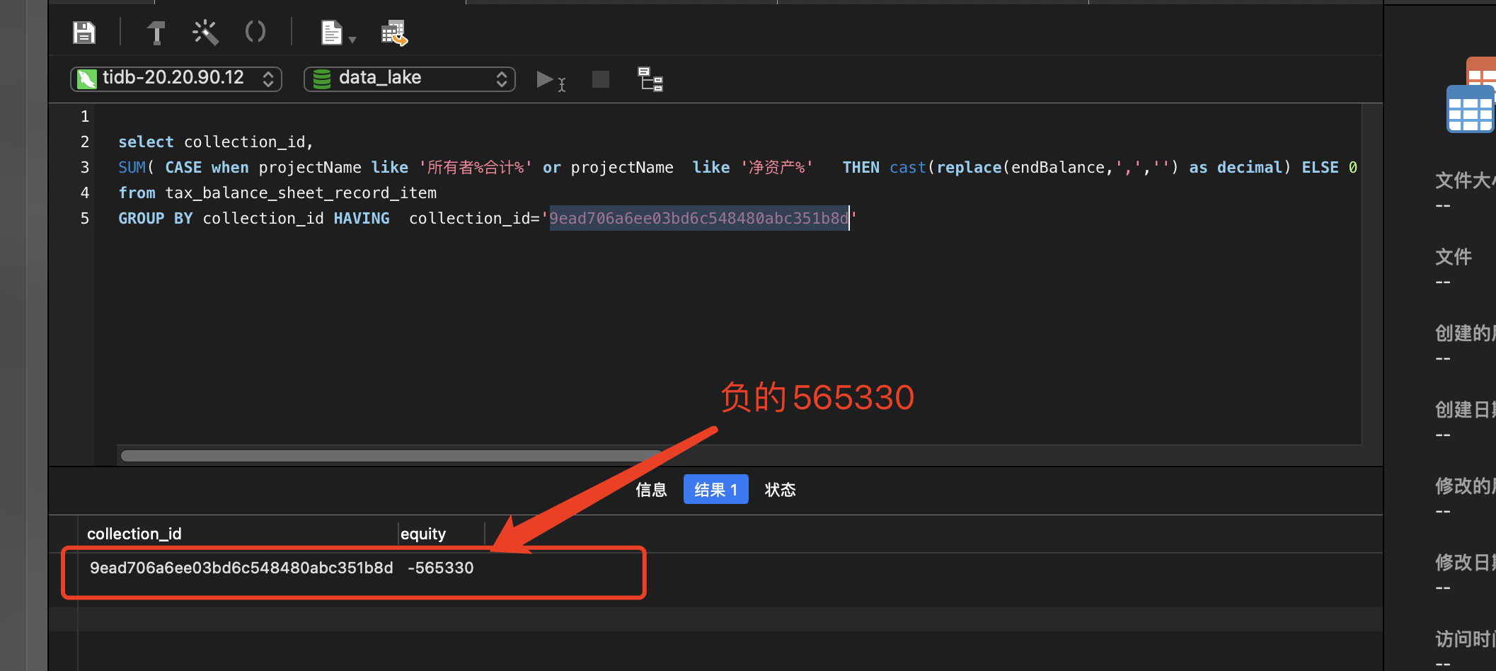| └─Projection_41 | 108652949.00 | 108644706 | batchCop[tiflash] | | tiflash_task:{time:1m48.1s, loops:1857, threads:32} | case(or(like(data_lake.tax_balance_sheet_record_item.projectname, 所有者%合计%, 92), like(data_lake.tax_balance_sheet_record_item.projectname, 净资产%, 92)), cast(replace(data_lake.tax_balance_sheet_record_item.endbalance, ,, ), decimal(10,0) BINARY), 0)->Column#19, data_lake.tax_balance_sheet_record_item.collection_id | N/A | N/A |