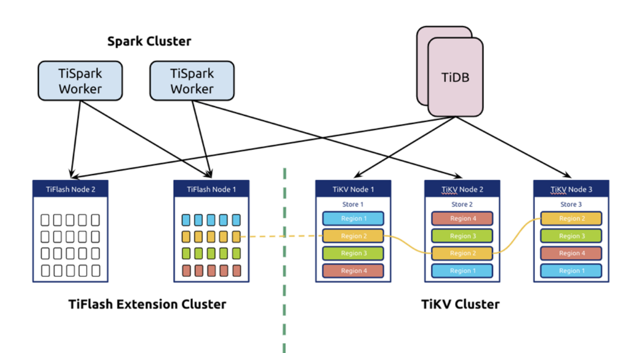 - OLAP 部分非常专业的深度优化,例如 TiSpark 可借助类似 clickhouse 的向量化引擎,按照和 TiKV 相同的 coprocessor 协议下推任务到 TiFlash,提升资源利⽤和性能。