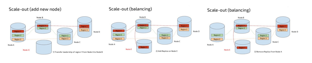 - TiKV 扩容操作仅需要在新增服务器上合理配置并启动服务即可, 新启动的 TiKV 服务会⾃动注册到现有集群的 PD 中, PD 会⾃动做在线的逐步负载均衡, 对业务⽆感知地, 逐步地把⼀部分数据迁移到新的 TiKV 服务中。⽽新投入的 TiKV 资源可以认为在启动的⼀瞬间就已经将资源添加到了现有集群, 不需要再等待漫⻓的, 外部控制的数据重分布过程 。
