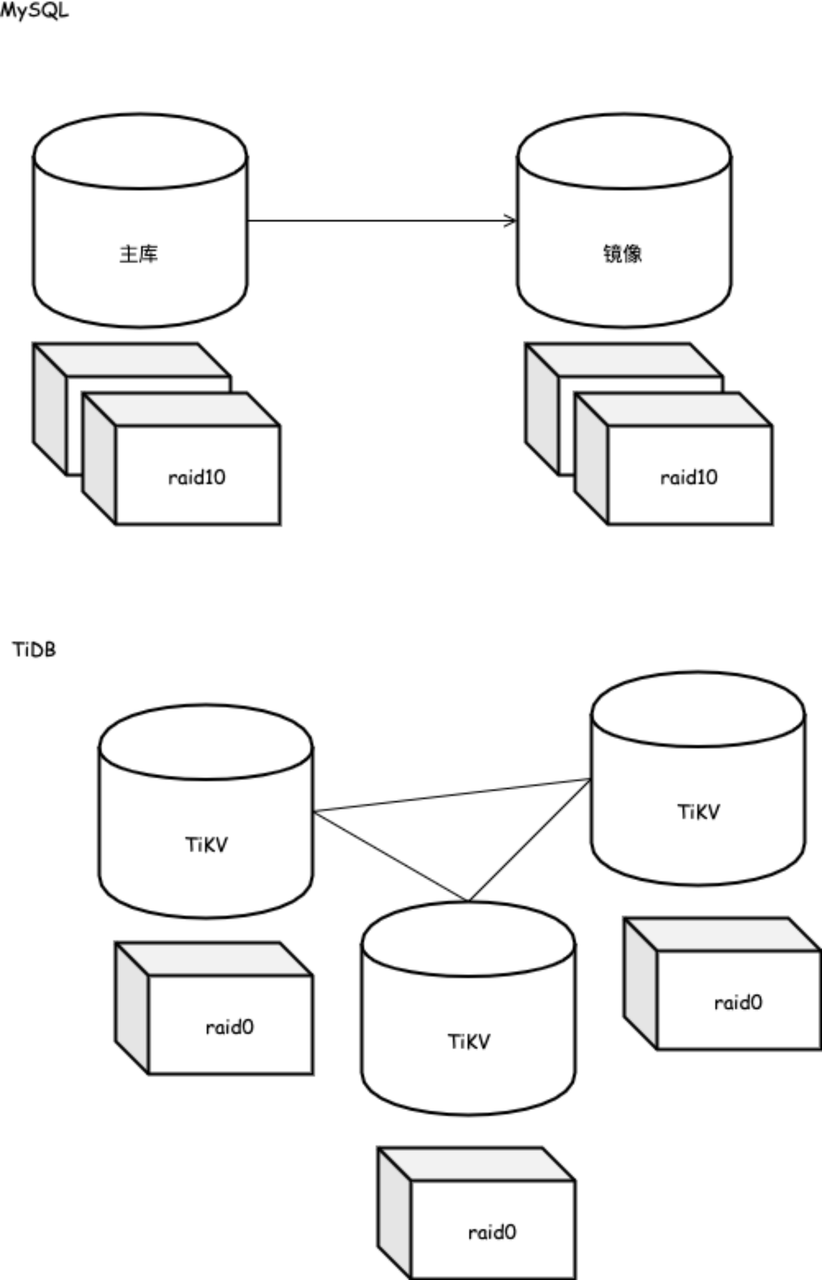 另外顺便提⼀下, 在新型(其实也没那么新, 只不过我们⽤的不算多)硬件, 例如 NVMe 存储设备⽅⾯, 由于 PCIE ⽆法再接 raid 了, 因此天然适合 TiDB 这样软件层强⼀直冗余, ⽽完全放弃 raid 硬件层冗余的模式。