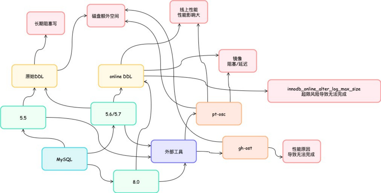 - MySQL 的 online DDL 始终让⼈难以完全信任,即使在 online DDL 随着版本完善的过程中,我们也不得不为了规避某些情况坚持使⽤外部变更⼯具。