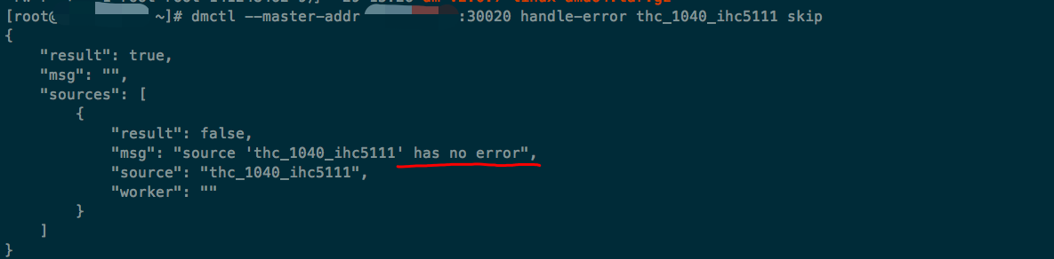 执行 dmctl --master-addr <ADDR> handle-error thc_1040_ihc5111 skip 命令,可以看到返回的 msg 是 “has no error”,但这个迁移任务明显是有错的,上图即可证明。这个消息,跟 skip 一个状态为 Running 的正常迁移任务是完全一致的,显然是不对的。