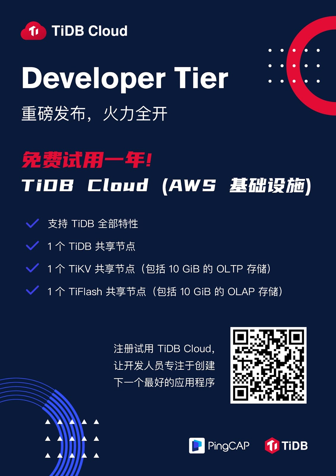 现 TiDB Cloud 重磅发布 Developer Tier,注册即可享受 Amazon Web Services 上免费试用 TiDB Cloud 一年!