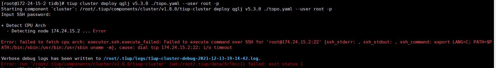 Error: failed to fetch cpu arch: executor.ssh.execute_failed: Failed to execute command over SSH for ‘root@174.24.15.2:22’ {ssh_stderr: , ssh_stdout: , ssh_command: export LANG=C; PATH=$PATH:/bin:/sbin:/usr/bin:/usr/sbin uname -m}, cause: dial tcp 174.24.15.2:22: i/o timeout