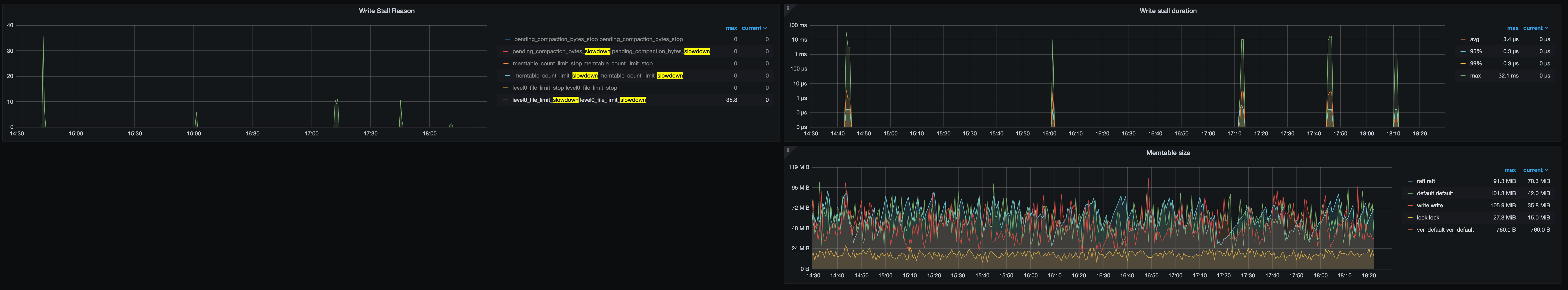 要在看一下,现在定位应该写入处理在 KV 层堆积,触发 write stall,需要对比一下TiKV 升级前后 RocksDB 参数,参考一下两个文档: