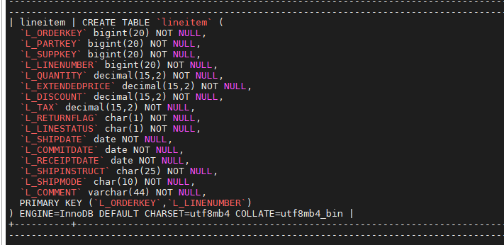 MySQL [tpch_10]> explain analyze SELECT n_name, sum(l_extendedprice * (1 - l_discount)) AS revenue FROM customer, orders, lineitem, supplier, nation, region WHERE c_custkey = o_custkey AND l_orderkey = o_orderkey AND l_suppkey = s_suppkey AND c_nationkey = s_nationkey AND s_nationkey = n_nationkey AND n_regionkey = r_regionkey AND r_name = ‘MIDDLE EAST’ AND o_orderdate >= ‘1994-01-01’ AND o_orderdate < date_add(‘1994-01-01’, INTERVAL ‘1’ year) GROUP BY n_name ORDER BY revenue DESC;
