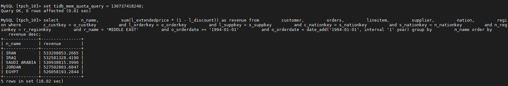 | └─Projection_25 | 1.00 | 5 | root | | time:1h14m53.7s, loops:6, Concurrency:OFF | tpch_10.nation.n_name, Column#54 | 1.88 KB | N/A |