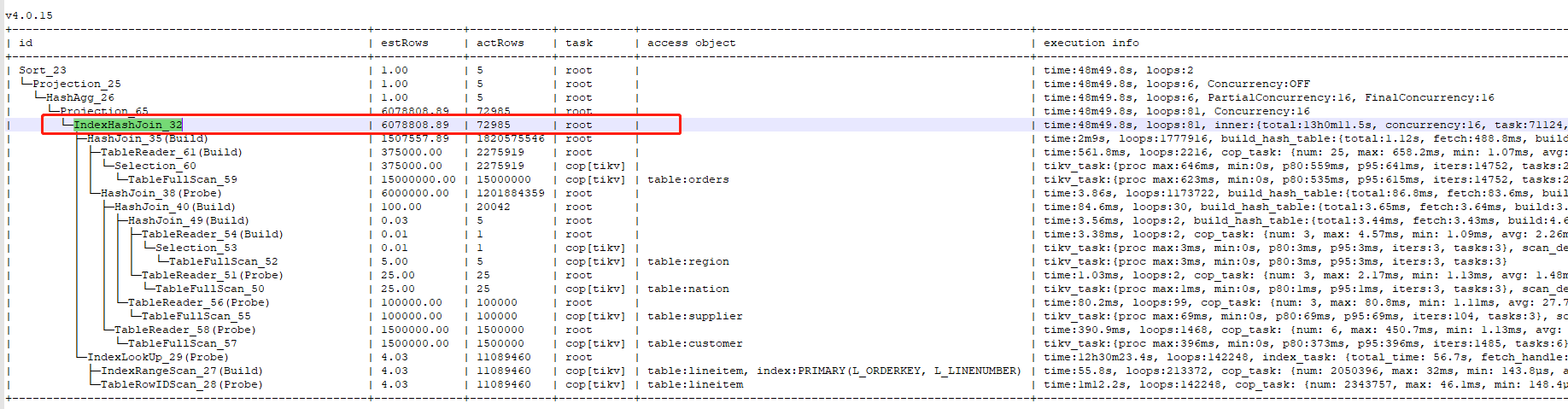 | └─IndexHashJoin_32 | 9351572.05 | 72985 | root | | time:1h14m53.7s, loops:97, inner:{total:38h44m20.2s, concurrency:32, task:71124, construct:31m22.3s, fetch:38h11m8.4s, build:9m32.7s, join:1m39.7s} | inner join, inner:IndexLookUp_29, outer key:tpch_10.orders.o_orderkey, inner key:tpch_10.lineitem.l_orderkey, equal cond:eq(tpch_10.orders.o_orderkey, tpch_10.lineitem.l_orderkey), eq(tpch_10.supplier.s_suppkey, tpch_10.lineitem.l_suppkey) | 89.0 GB | N/A |