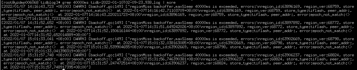[2022/01/10 15:31:51.270 +08:00] [WARN] [backoff.go:149] [“regionMiss backoffer.maxSleep 40000ms is exceeded, errors: