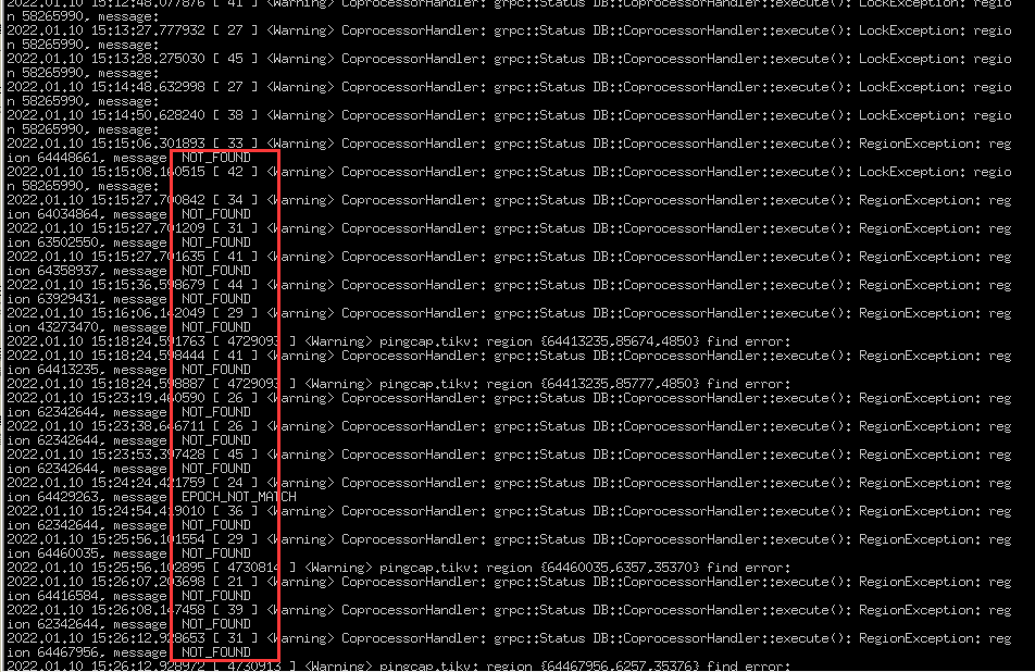 2022.01.10 15:31:10.994648 [ 35 ] CoprocessorHandler: grpc::Status DB::CoprocessorHandler::execute(): RegionException: region 64503303, message: NOT_FOUND