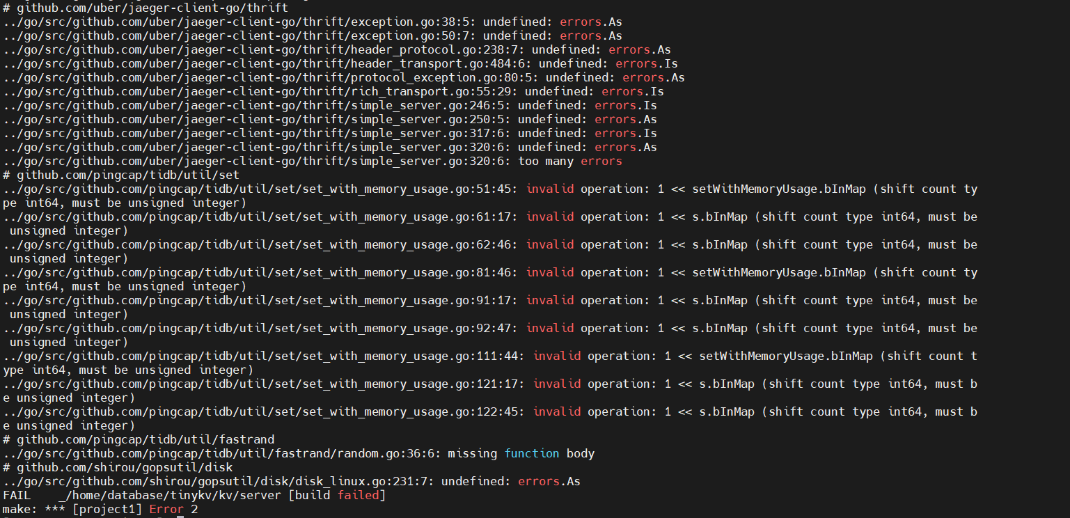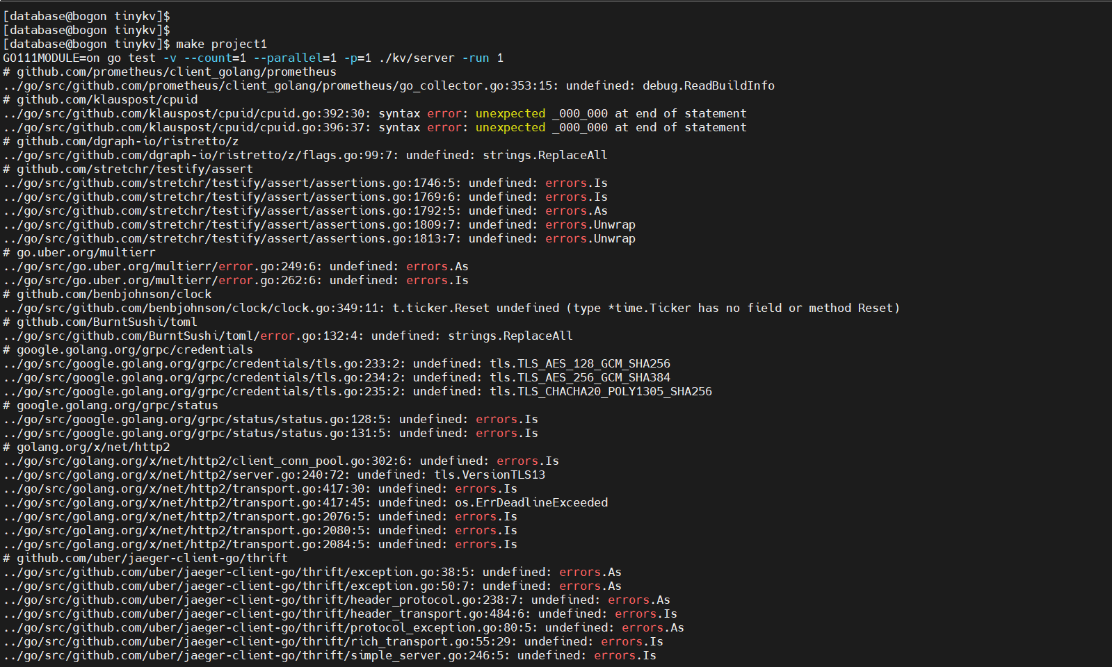 最近在完成tiny kv项目 我完成project1后 准备运行 在下载完必要的包后 执行make project1后发现这种情况 :