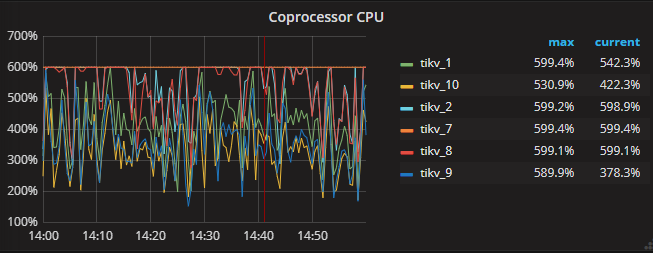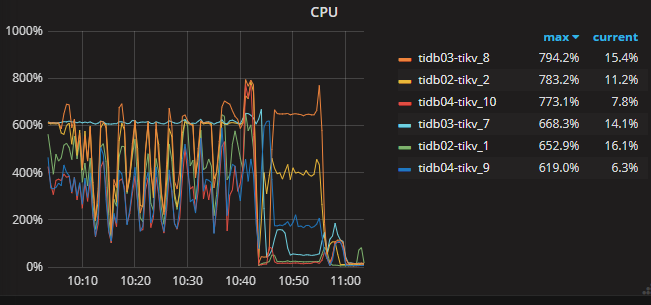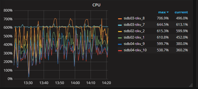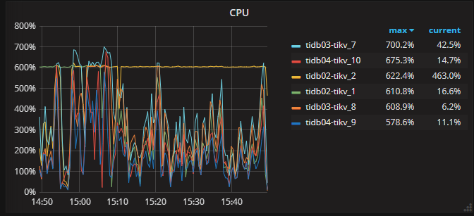 2. 从cpu截图上看,每个tikv实例的最大cpu都差不多,当前tikv2的cpu较高,是由于tikv2-read当前在大量的读取数据,所以cpu较高.