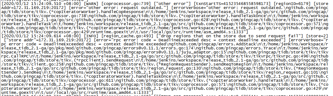 我描述一下我的服务器的性能:四台服务器,配置一样,都是16C,内存256g,硬盘是SSD,四块,容量是960G*4。一台复用TIDB-server和PD,一台复用PD和TIKV,剩下两台纯TIKV。每个TIKV上是2个实例,共6个实例。我安装的时候配置的每个TIKV的coprocessor都是6, defaultcf—lock-cache-size是64GB。现在每个实例的CPU都蛮高的,还有一个一直是类似直线,已经分裂过很多次,不能解决。下面是截图和慢查询日志: