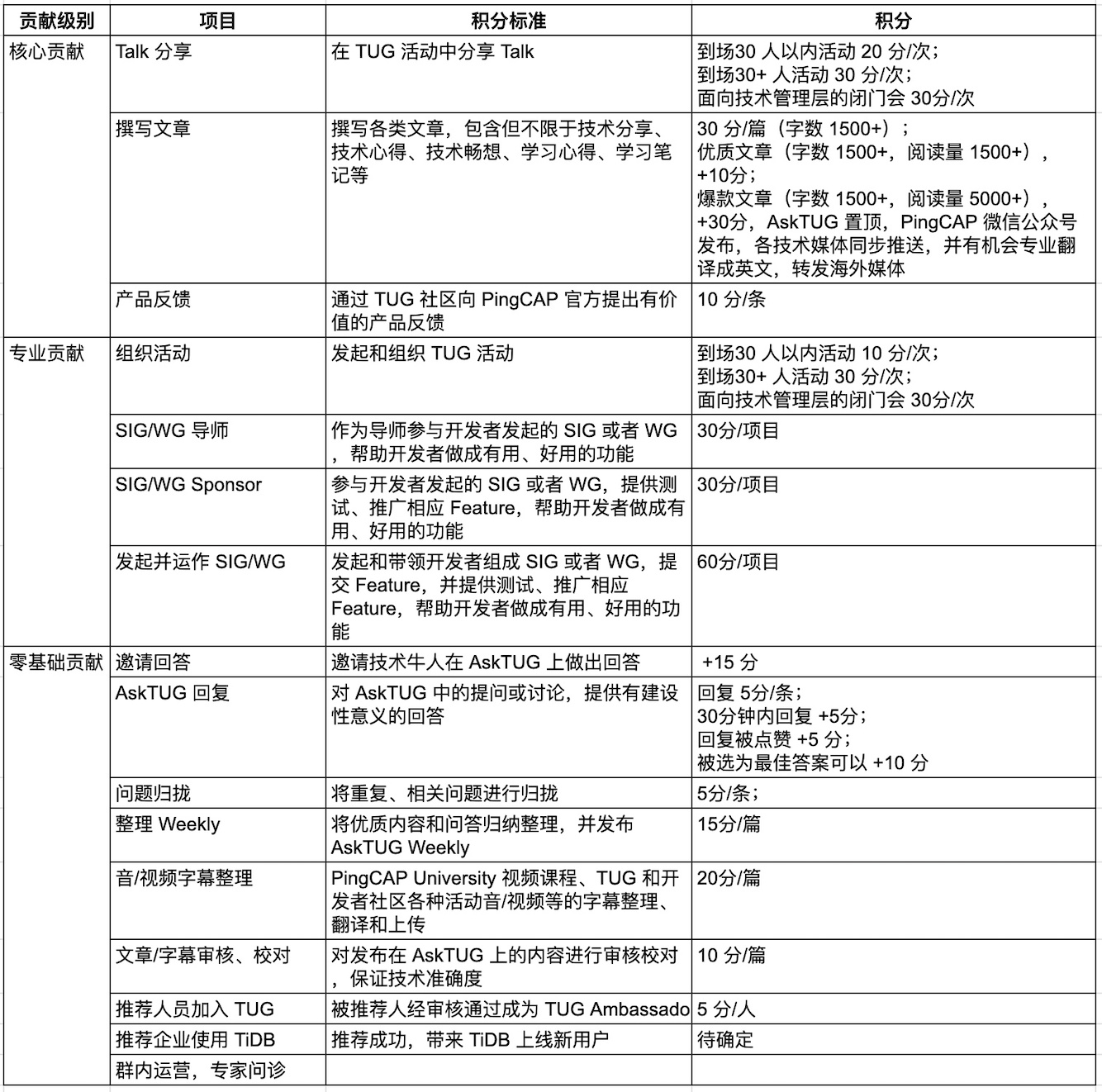 为了感谢成员们持续的付出,TUG 将对所有成员的各种贡献进行积分,并给予特定权益。各项贡献积分情况如下: