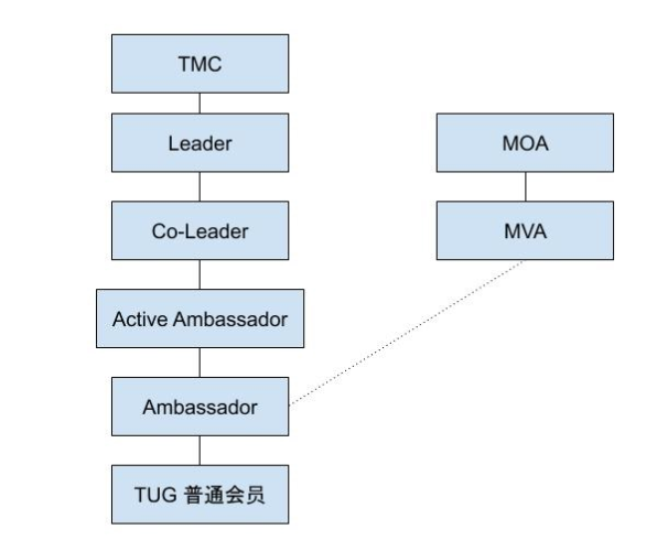 - 管理线:上升通道为 TUG 管理成员,包括 Team Co-Leader、Team Leader、TMC 成员。TUG 管理成员任期为一年。TMC 成员、Team Leader 每年通过换届选举产生,Team Co-Leader 在换届选举后由 Team Leader 进行委任。