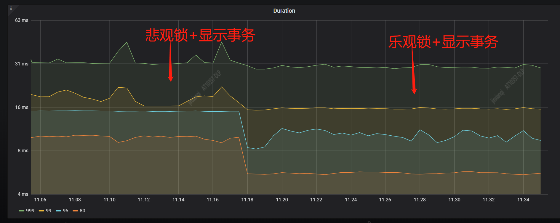 下面是【悲观锁+显示事务】和【乐观锁+显示事务】的性能对比