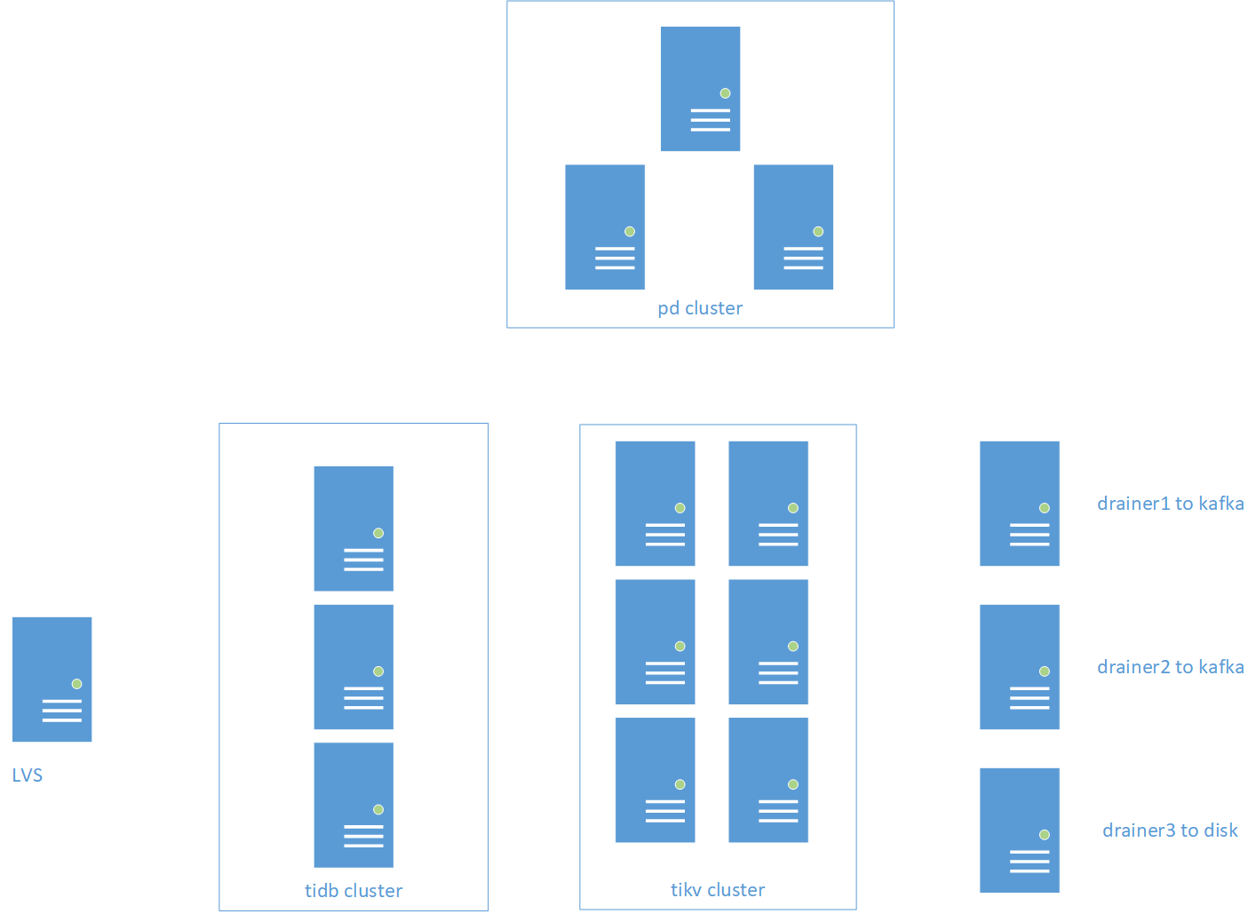说明: 业务数据通过 Otter 从 MySQL 向 2 个 TiDB 节点同步数据,另外 3 个 TiDB 节点用于业务访问。4 个 Drainer 实时同步 TiDB 数据到下游 Kafka 集群用于获取 TiDB 增量数据,然后汇总成业务数据,1个 Drainer 同步 TiDB 数据到服务器磁盘,用于简单问题分析,比如某个时间段 TPS 特别高,可以利用 reparo 工具解析指定时间段内的 binlog 来分析问题。