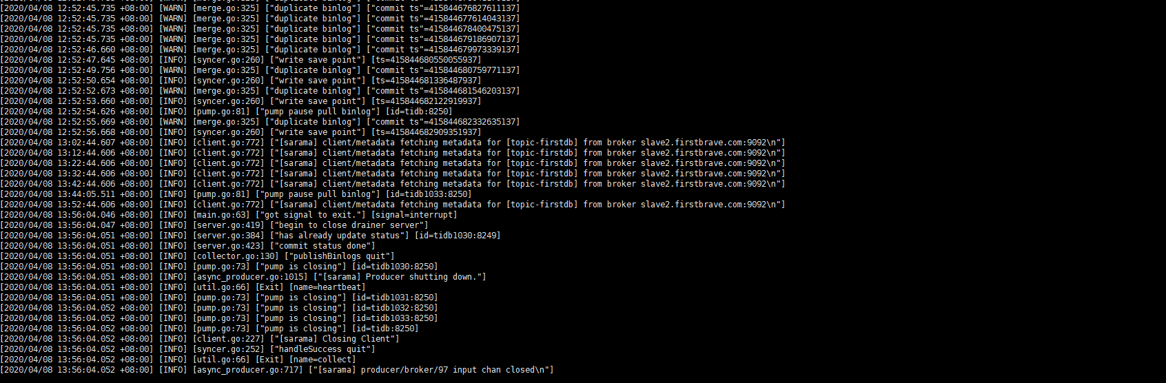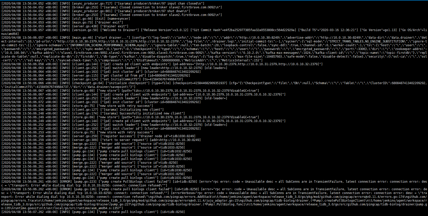 - 【问题描述】Tidb binlog 通过 Drainer实时写入kafka时出现问题。tidb数据库数据发生改变时,binlog未写入kafka,没有任何错误,没有反应。只有执行 ./bin/drainer -config drainer.toml ,binlog才会写入kafka。以下是drainer的配置,哪里出了问题呢?如有描述不清的地方,请指出来。