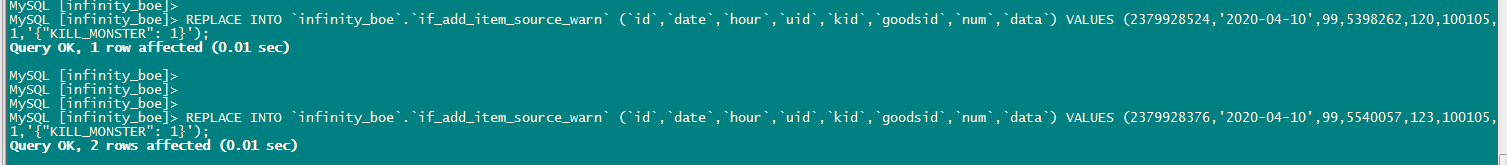 previous statement: REPLACE INTO `infinity_boe`.`if_add_item_source_warn` (`id`,`date`,`hour`,`uid`,`kid`,`goodsid`,`num`,`data`) VALUES (2379928318,'2020-04-10',99,4576340,101,100103,1,'{\\\"USE_BACKPACK_ITEM\\\": 1}');"] [session="{\