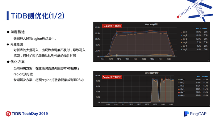 该业务对批量数据导入的时间很敏感,但我们测试时发现虽然底层有 6 个 TiKV 节点,但每次数据开始导入时有 3 个 TiKV 节点负载特别高,另外 3 个节点负载很低,同时写入也有瓶颈。通过排查发现这个问题的原因在于,对于快速的超大表的数据写入,TiKV 的热点调度并不及时,没有办法做到负载均衡,进而导致热点。