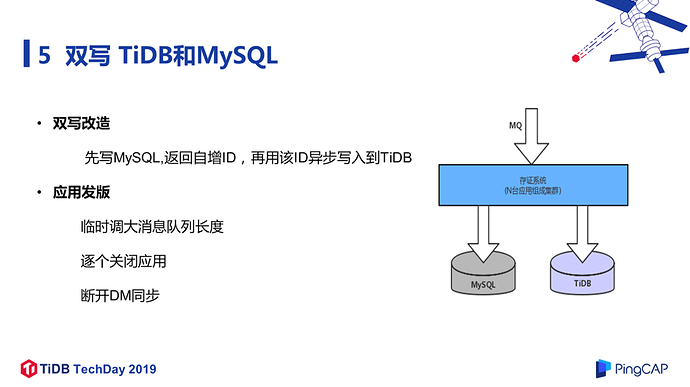 在读流量切换到 TiDB 没有出现什么问题之后,我们再把写流量切换到 TiDB,但也不是一次性切换,我们选择先双写 TiDB 和 MySQL:先写 MySQL 返回自增 ID,再用该 ID 加上业务数据异步写入到 TiDB;上下游的 ID 保存一致方便我们进行数据校验。在双写改造完成后,架构如图 18 所示。应用准备发版时,为了保证业务暂停的时间足够短,我们临时调大了消息队列 MQ 的长度,因为在整个应用关闭之后,消息队列仍在存储消息,可能会把消息队列存满。调大消息队列长度之后,再逐个关闭应用,等到所有应用都停掉后,在确认 DM 的数据同步已经追平后,就可以把 DM 断开,接下来就可以逐个启动新版本的应用了。 业务停止时间(最后一个应用关闭到新版本第一个应用启动的时间间隔)控制在 1 分钟以内,对应用的影响非常小