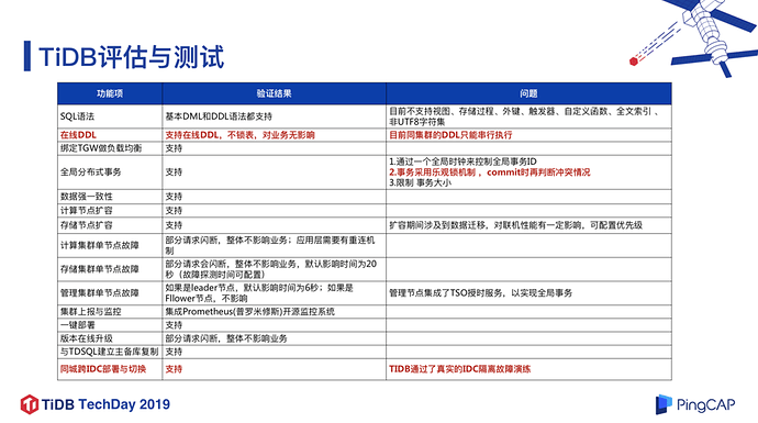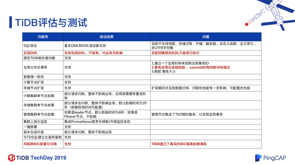 • TiDB 采用乐观锁事务模型 。这和 MySQL 的悲观锁模型是不太一样的,这个特性对于某些业务场景的兼容性可能会有问题。 TiDB 3.0 版本中已经试验性支持了悲观锁,并且在今年下半年有望成为一个正式功能,这是一个很好的消息。在金融场景里面悲观锁应用还是比较广泛的