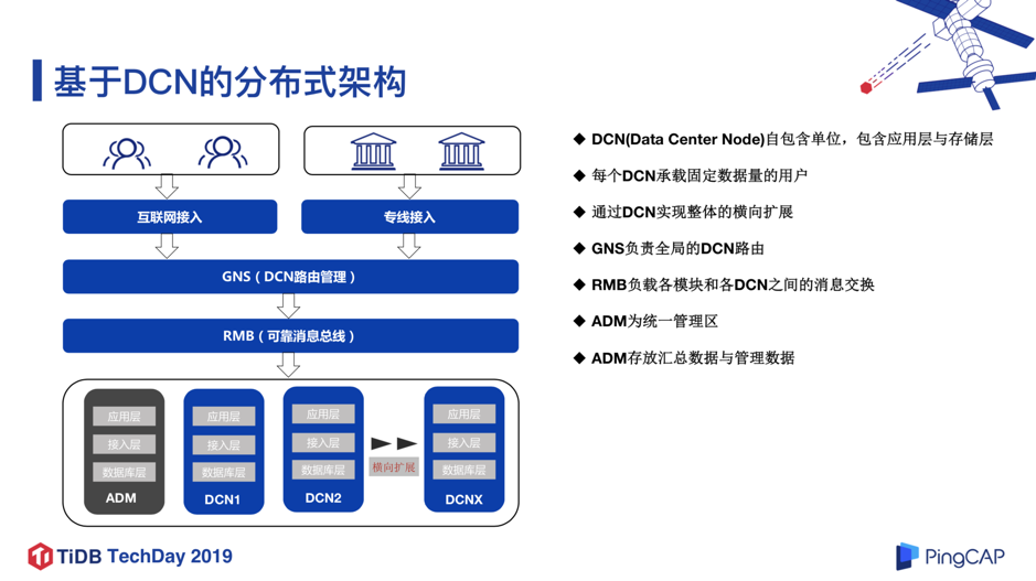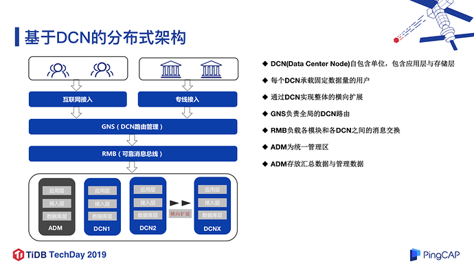 如图 2 所示,为了实现 DCN 架构,这里有两个关键组件:RMB 和 GNS。RMB 负责各个模块以及各个 DCN 之间的消息通信;GNS 负责全局的 DCN 路由,即某个用户保存在哪个 DCN。另外这里有一个比较特殊的地方就是 ADM 管理区,它是一个统一的管理区,保存着无法进行 DCN 拆分的全局业务数据,和通过各 DCN 进行汇总的数据。后来 ADM 区成为了一个 TDSQL 的瓶颈,这是我们引入 TiDB 的动机之一。
