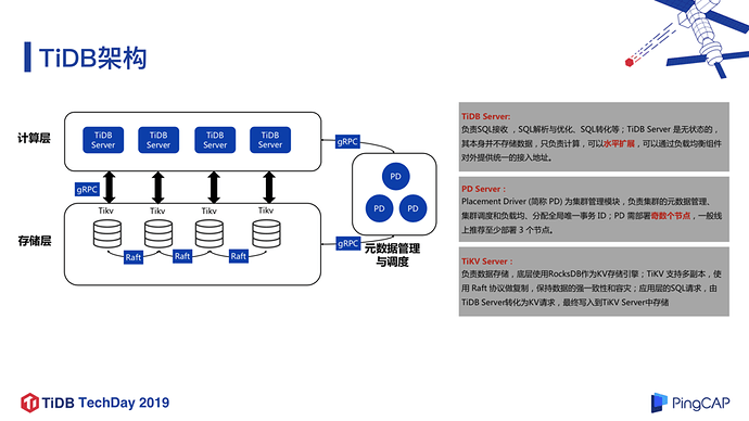 这里展示了 TiDB 的基本架构模型,非常简洁优雅的架构,相信稍微了解 TiDB 的同学,对这个架构都比较熟悉了,在这里就不再赘述。当然,现在 TiDB 3.0 版本有了新的特性以及模块加入,比如 Titan 引擎, 针对 RocksDB 大 Value 写放大问题做了很大的优化和性能提升,再比如列式存储引擎 TiFlash ,为实现真正的 HTAP 奠定了基础。