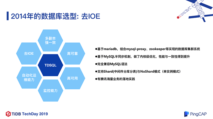 TDSQL 是基于 MariaDB 内核 ,结合 mysql-proxy、ZooKeeper 等开源组件实现的数据库集群系统,并且基于 MySQL 半同步的机制,在内核层面做了大量优化,在性能和数据一致性方面都有大幅的提升,同时完全兼容 MySQL 语法,支持 Shard 模式(中间件分库分表)和 NoShard 模式(单机实例),同时还集成了管控平台,智能运维等功能模块。2014 年,TDSQL 已经支撑了腾讯内部的海量的计费业务,由于计费业务的场景和银行的场景有所类似,对数据库的可靠性和可用性要求也相近,所以我们当时选择了 TDSQL 作为微众银行的核心数据库。