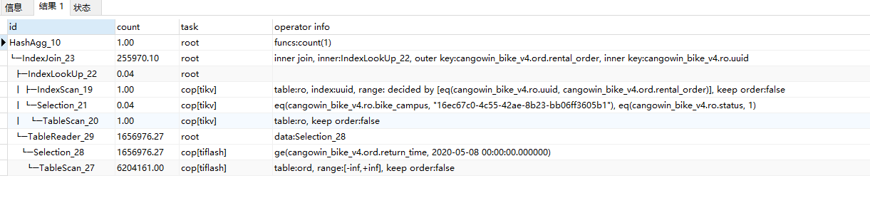 执行速度快了很多,和Mysql的速度基本一样了,不知道是不是因为TiFlash的加速