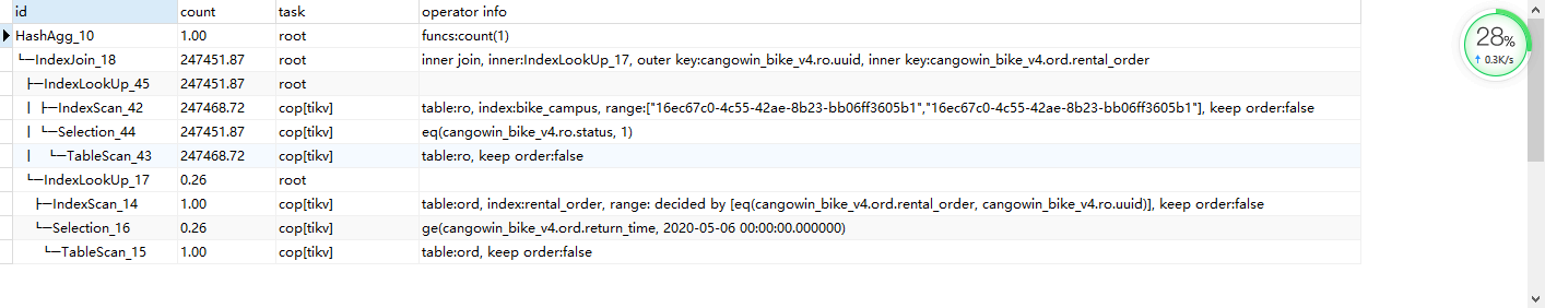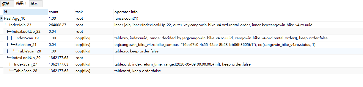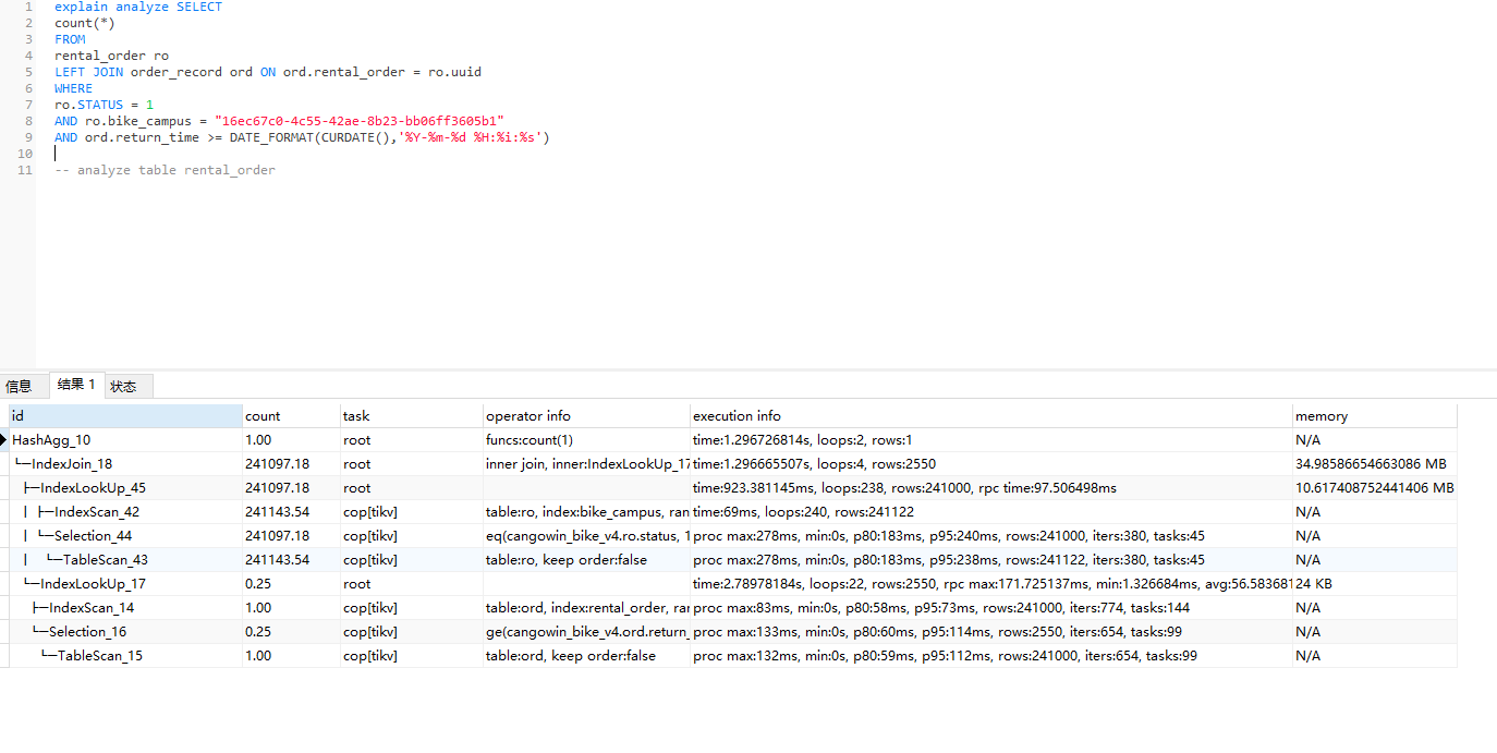 1,烦请执行下面 sql 看看看看结果,使用 tikv 作为存储引擎: