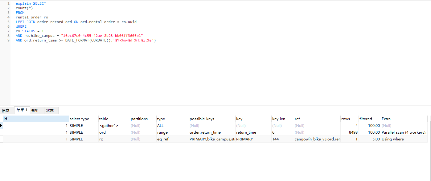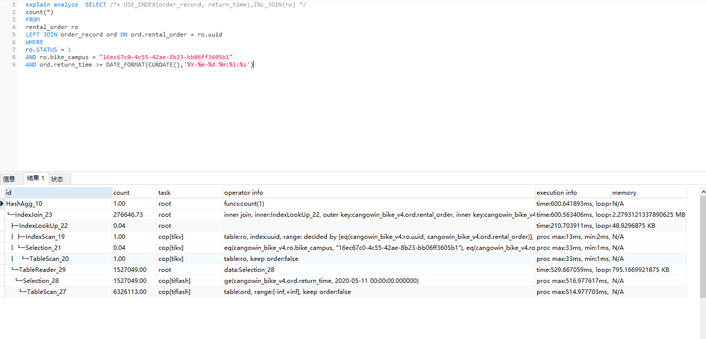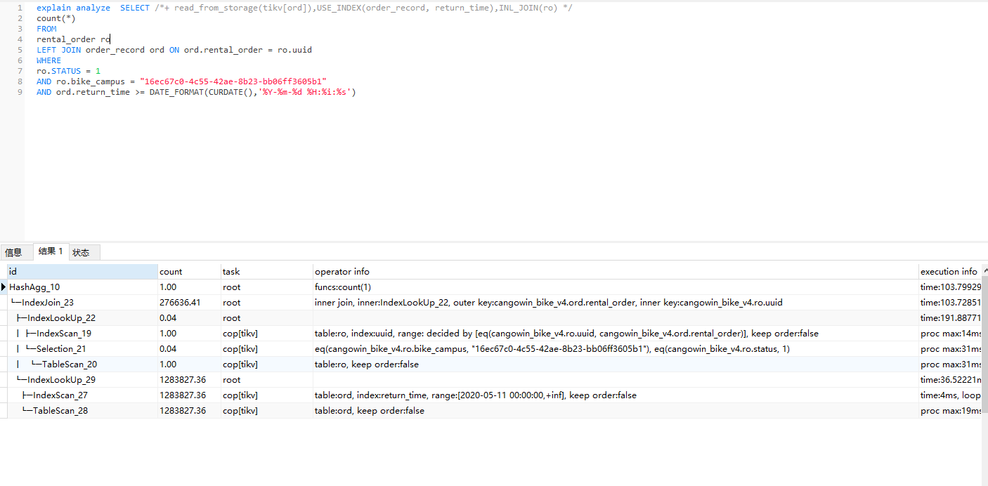 现象:USE_INDEX(order_record, return_time)好像可以去掉,优化器好像能选对索引,对查询影响不大。主要是使用INL_JOIN(ro)后,速度快了很多。