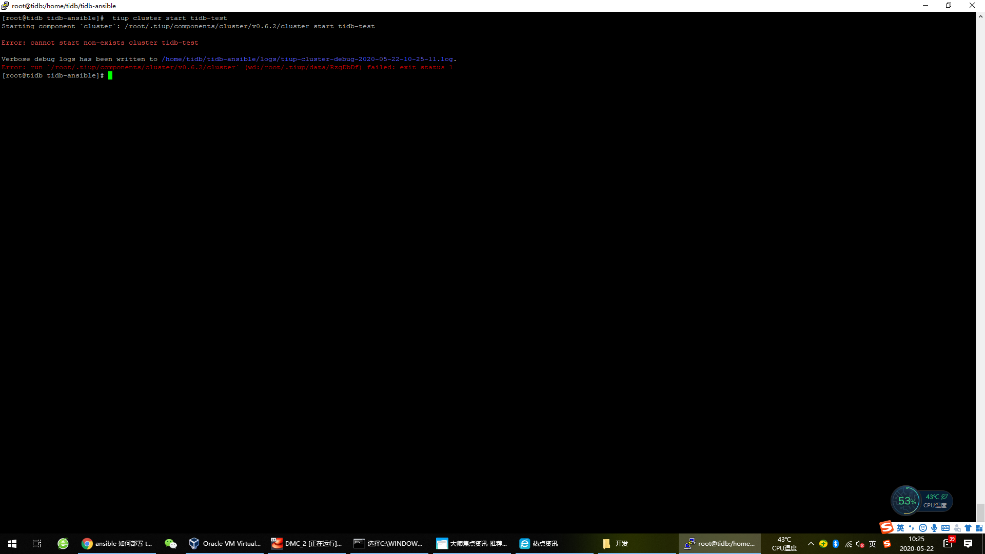 Error: run /root/.tiup/components/cluster/v0.6.2/cluster (wd:/root/.tiup/data/RzVjNN9) failed: exit status 1