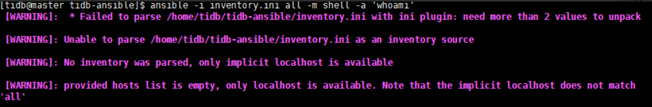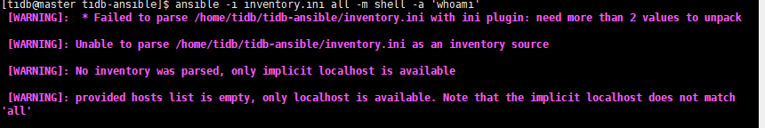 ansible 安装过程中报错 Failed to parse inventory.ini with ini plugin unable to parse as an inventory source,完整报错如下: