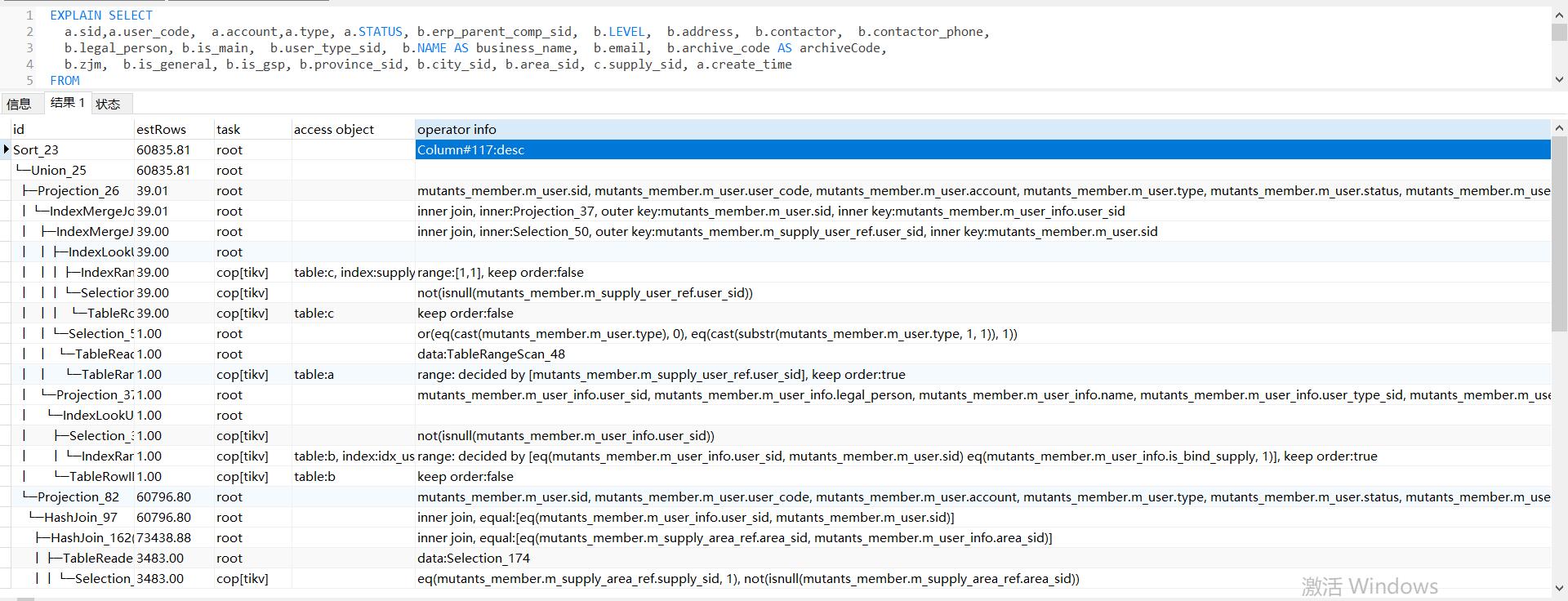 SELECT a.sid,a.user_code, a.account,a.type, a.STATUS, b.erp_parent_comp_sid, b.LEVEL, b.address, b.contactor, b.contactor_phone, b.legal_person, b.is_main, b.user_type_sid, b.NAME AS business_name, b.email, b.archive_code AS archiveCode, b.zjm, b.is_general, b.is_gsp, b.province_sid, b.city_sid, b.area_sid, c.supply_sid, a.create_time FROM m_user a, m_user_info b, m_supply_user_ref c WHERE a.sid = b.user_sid AND b.is_bind_supply = 1 AND a.sid = c.user_sid AND ( a.type = 0 OR ( substr( a.type, 1, 1 ) = 1 )) AND c.supply_sid IN ( 1 ) UNION ALL SELECT a.sid, a.user_code, a.account, a.type, a.STATUS, b.erp_parent_comp_sid, b.LEVEL, b.address, b.contactor, b.contactor_phone, b.legal_person, b.is_main, b.user_type_sid, b.NAME AS business_name, b.email, b.archive_code AS archiveCode, b.zjm, b.is_general, b.is_gsp, b.province_sid, b.city_sid, b.area_sid, c.supply_sid, a.create_time FROM m_user a, m_user_info b, m_supply_area_ref c WHERE a.sid = b.user_sid AND b.is_bind_supply = 0 AND b.area_sid = c.area_sid AND supply_sid IN ( 1 ) AND ( a.type = 0 OR ( substr( a.type, 1, 1 ) = 1 )) ORDER BY sid DESC