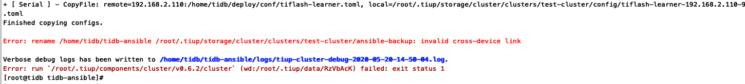 - 执行 tiup cluster import -d /home/tidb/tidb-ansible 报错:invalid cross-device link,截图如下