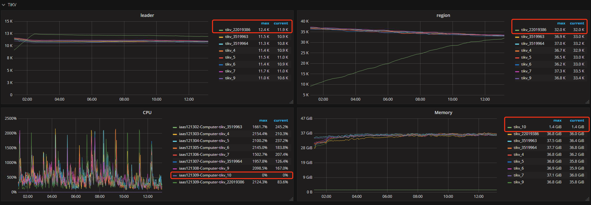 id为10的tikv节点状态已经为tombstone并且缩容再扩容后重新加入集群的id为22019386,但看监控页面部分面板还能看到两个id同时存在,如下图: