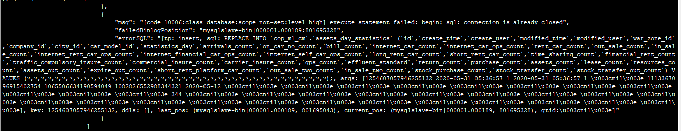 “msg”: “[code=10006:class=database:scope=not-set:level=high] execute statement failed: begin: sql: connection is already closed