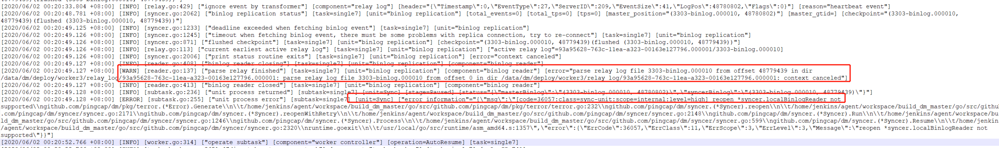 [2020/06/01 21:20:34.154 +08:00] [WARN] [reader.go:137] [“parse relay finished”] [task=single7] [unit=“binlog replication”] [component=“binlog reader”] [error=“parse relay log file 3303-binlog.000010 from offset 48779439 in dir /data/dm/deploy/worker3/relay_log/93a95628-763c-11ea-a323-00163e127796.000001: parse relay log file 3303-binlog.000010 from offset 0 in dir /data/dm/deploy/worker3/relay_log/93a95628-763c-11ea-a323-00163e127796.000001: context canceled”] [2020/06/01 21:20:34.154 +08:00] [INFO] [reader.go:413] [“binlog reader closed”] [task=single7] [unit=“binlog replication”] [component=“binlog reader”] [2020/06/01 21:20:34.154 +08:00] [INFO] [subtask.go:236] [“unit process returned”] [subtask=single7] [unit=Sync] [stage=Paused] [status="{“masterBinlog”:"(3303-binlog.000010, 48780802)",“syncerBinlog”:"(3303-binlog.000010, 48779439)"}"] [2020/06/01 21:20:34.154 +08:00] [ERROR] [subtask.go:255] [“unit process error”] [subtask=single7] [unit=Sync] [“error information”="{“msg”:"[code=36057:class=sync-unit:scope=internal:level=high] reopen *syncer.localBinlogReader not supported\ngithub.com/pingcap/dm/pkg/terror.(*Error).Generate\ \t/home/jenkins/agent/workspace/build_dm_master/go/src/github.com/pingcap/dm/pkg/terror/terror.go:232\ngithub.com/pingcap/dm/syncer.(*Syncer).reopen\ \t/home/jenkins/agent/workspace/build_dm_master/go/src/github.com/pingcap/dm/syncer/syncer.go:2171\ngithub.com/pingcap/dm/syncer.(*Syncer).reopenWithRetry\ \t/home/jenkins/agent/workspace/build_dm_master/go/src/github.com/pingcap/dm/syncer/syncer.go:2148\ngithub.com/pingcap/dm/syncer.(*Syncer).Run\ \t/home/jenkins/agent/workspace/build_dm_master/go/src/github.com/pingcap/dm/syncer/syncer.go:1246\ngithub.com/pingcap/dm/syncer.(*Syncer).Process\ \t/home/jenkins/agent/workspace/build_dm_master/go/src/github.com/pingcap/dm/syncer/syncer.go:599\ngithub.com/pingcap/dm/syncer.(*Syncer).Resume\ \t/home/jenkins/agent/workspace/build_dm_master/go/src/github.com/pingcap/dm/syncer/syncer.go:2320\ runtime.goexit\ \t/usr/local/go/src/runtime/asm_amd64.s:1357",“error”:{“ErrCode”:36057,“ErrClass”:11,“ErrScope”:3,“ErrLevel”:3,“Message”:“reopen *syncer.localBinlogReader not supported”}}"] [2020/06/01 21:20:37.765 +08:00] [INFO] [worker.go:314] [“operate subtask”] [component=“worker controller”] [operation=AutoResume] [task=single7] [2020/06/01 21:20:37.766 +08:00] [INFO] [task_checker.go:365] [“dispatch auto resume task”] [component=“task checker”] [task=single7] [opLogID=738] [2020/06/01 21:20:38.765 +08:00] [INFO] [worker.go:793] [“start to execute operation”] [component=“worker controller”] [oplog="{“id”:738,“task”:{“op”:6,“name”:“single7”},“ts”:1591017637765937847}"]